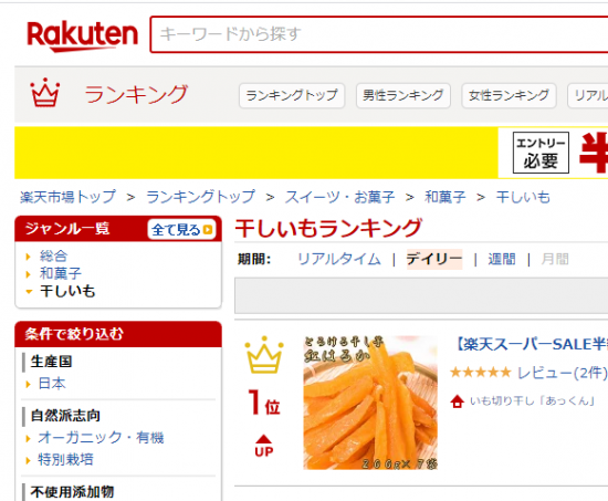2019年楽天スーパーセールで「干し芋」で1位獲得しました。(^^♪